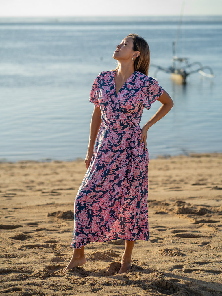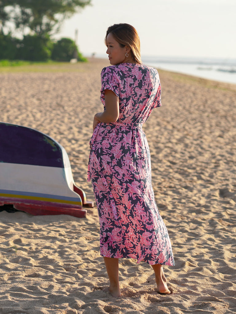 Our statement-making dress is available in modern Ikat prints that will take you from daytime to dinner. The long chic wrap cut makes this dress universally flattering and so easy to wear.