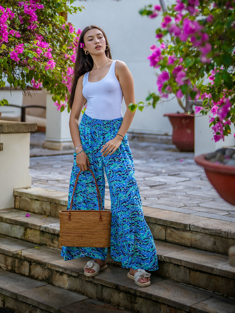 Three IslandsThese stunning, wide-leg pants boast a gorgeous, flowy silhouette. A wide, elastic waist allows the pants to work for a range of sizes. Pair them with a fitted tank, tee and flats for a fun day look, or a slim cut top or sweater and strappy heels for night.