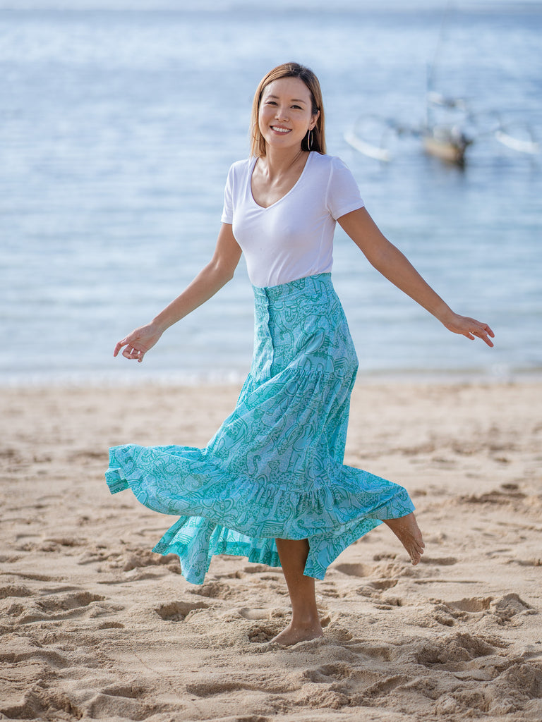 Three IslandsThis is the skirt you reach for when you want to capture vacation vibes without even stepping on a plane. The Vineyard Skirt features three tiers and a row of buttons down the front. In a maxi length. Pair it with a crisp white tee & strappy sandals for an effortless, endless summer look.